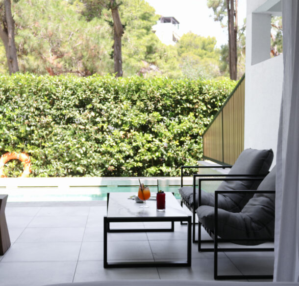 Relax in one of Azur’s pristine, peaceful rooms or suites with private balconies offering views of pine trees and all the privacy you could ask for while still being close to Vouliagmeni beach and the area’s glamorous restaurants, bars and shops. Each and every space has a contemporary, yet cozy style and is enriched with luxurious amenities aiming to provide you with everything you need to begin your exciting days in Athens or recoup after a long day of sightseeing, romance, fun and/or work. All 40 rooms and suites are front view, with large terraces overlooking lush greenery. During your stay with us you will enjoy high-speed internet access throughout the entire hotel, convenient business services at our 24 hour reception desk while our friendly and experienced staff will make sure your stay is truly memorable and comfortable.